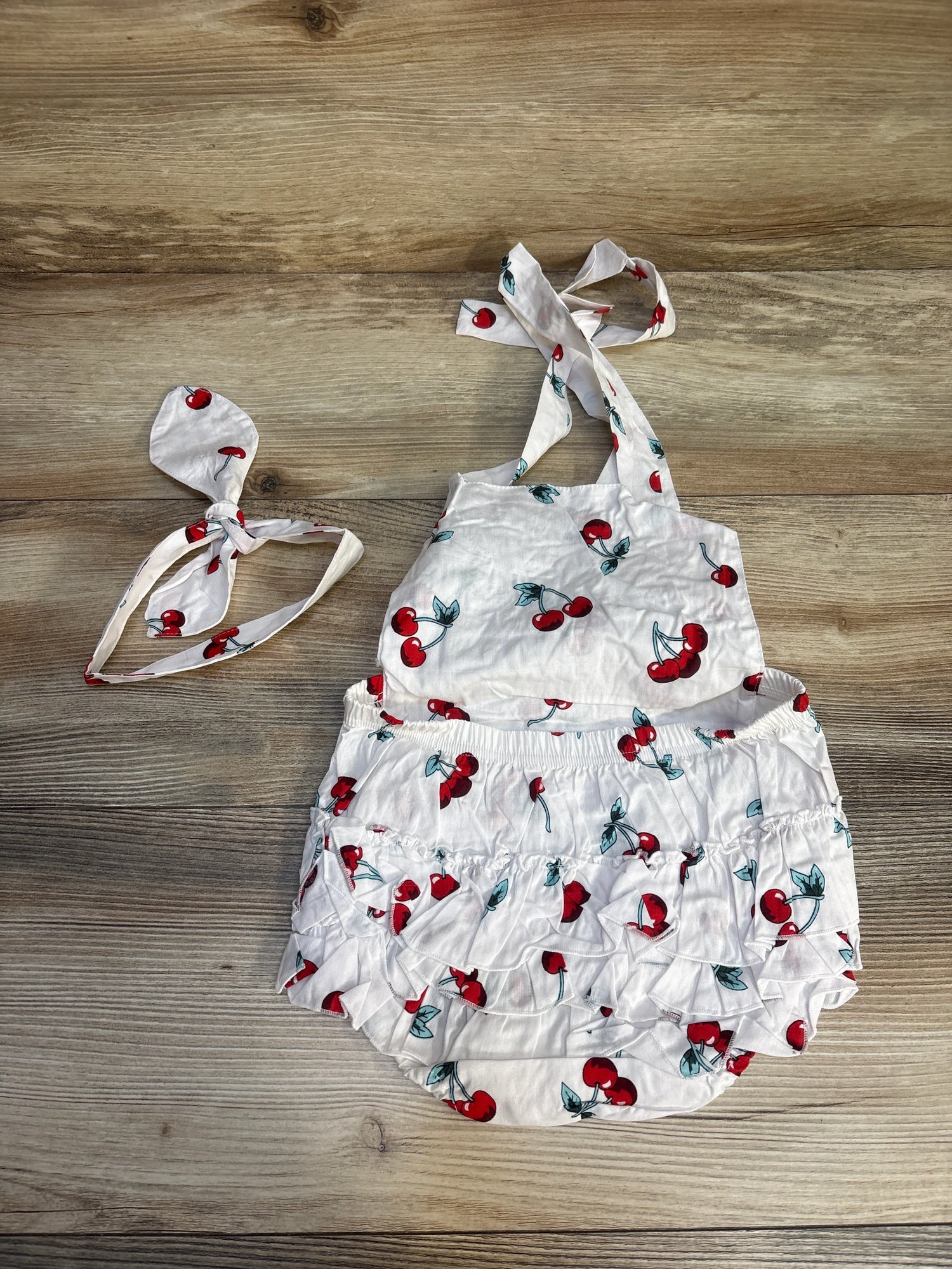 2pc Cherry Print Ruffle Romper + Headwrap White sz 18-24m