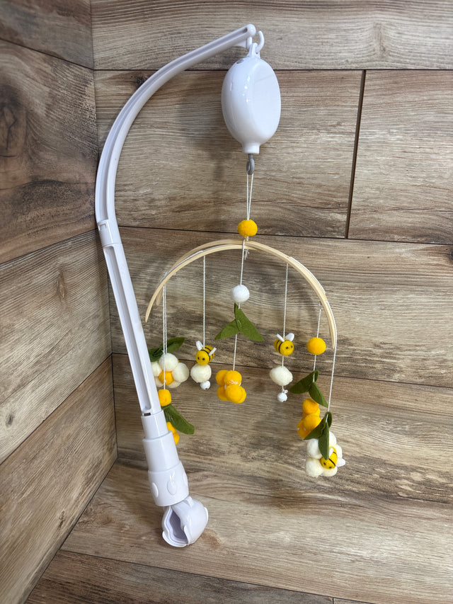 - Nursery mobile featuring bees, pom poms, and flowers made from felt.