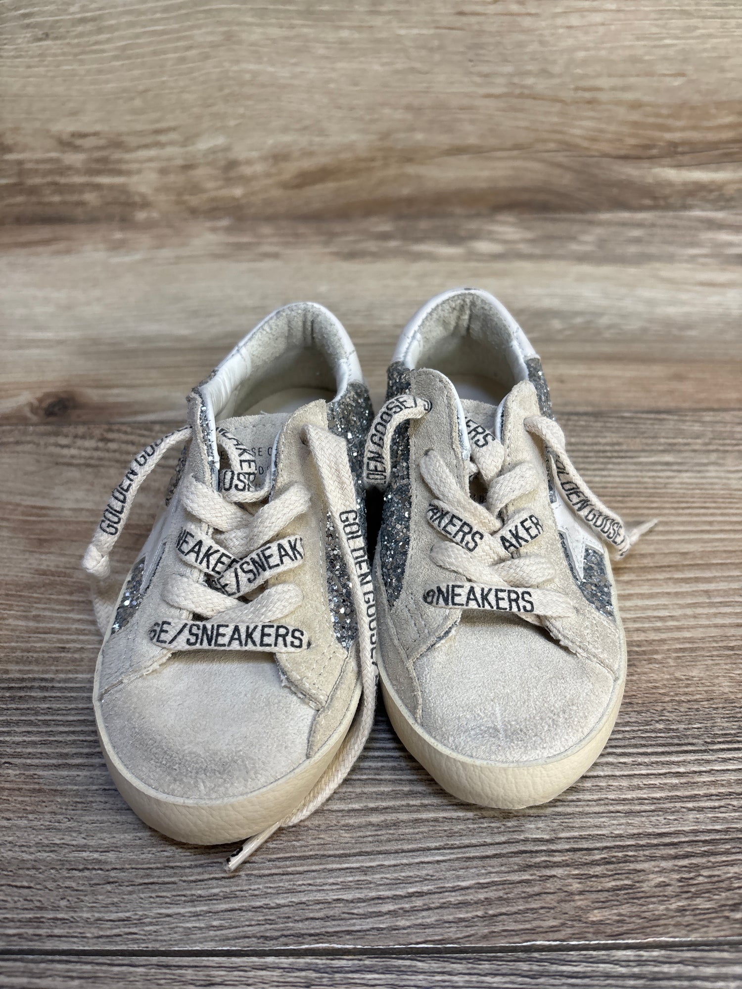 - Golden Goose "Super Star" sneakers boast a glittery leather and suede upper