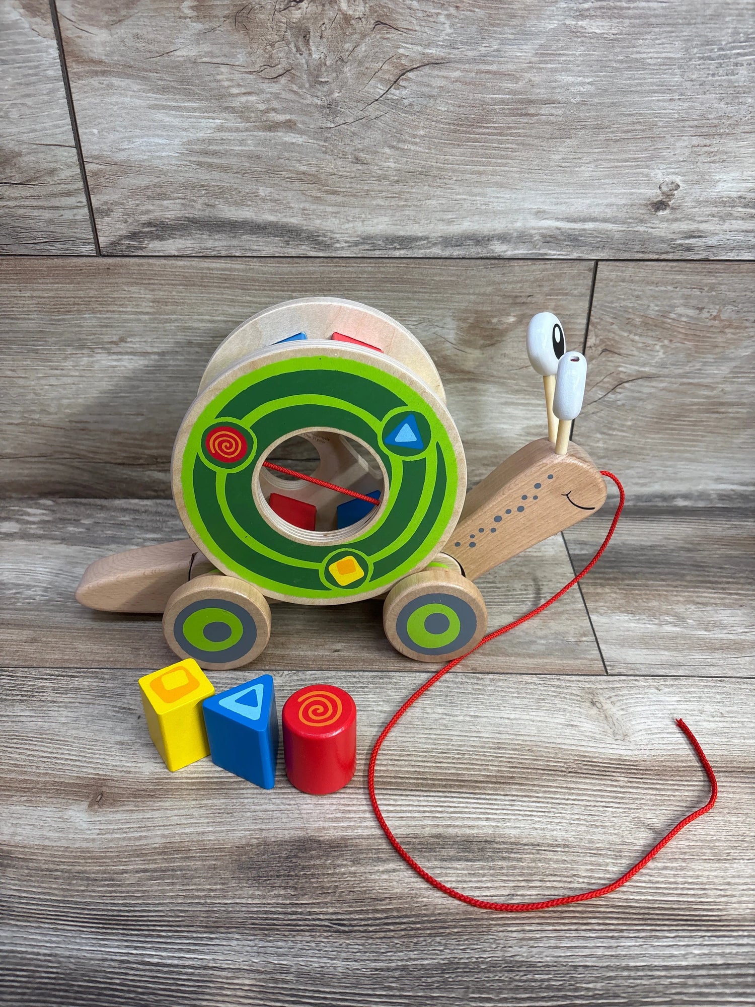 - CONVENIENT PULL STRING: The string is long enough to pull easily behind as sorted blocks spin round and the snail’s tail waves