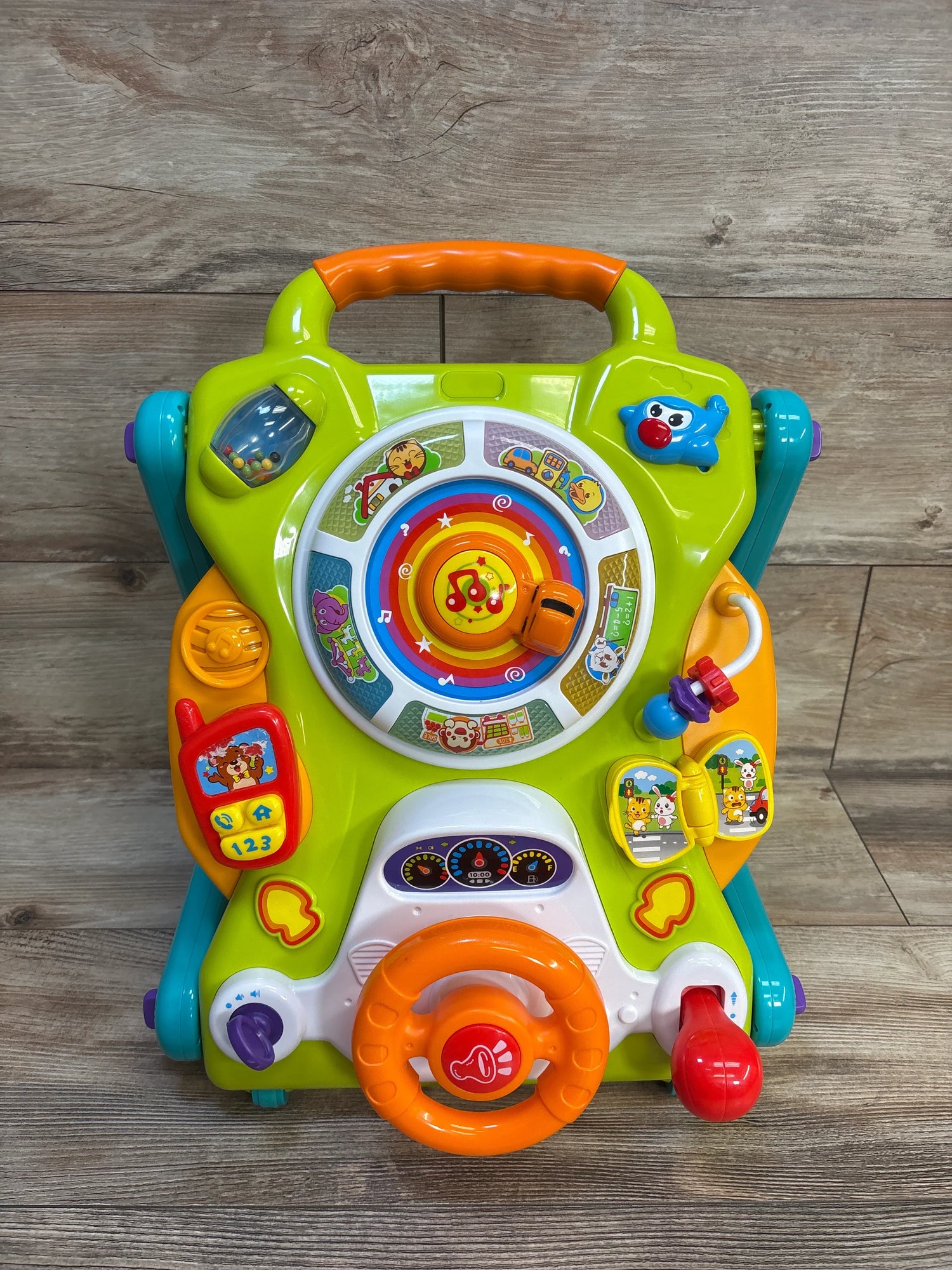 - INTERACTIVE ACTIVITY CENTER: Kids activity table with simulated driving, happy town, engine switch, lever, airplane, rotated rattle, mobile phone, colorful spinning beads, turning page. Sit to stand activity center plays various sound effects and LED flashing, enhance kids’ sensation. A-must-have for interact & connect through play.