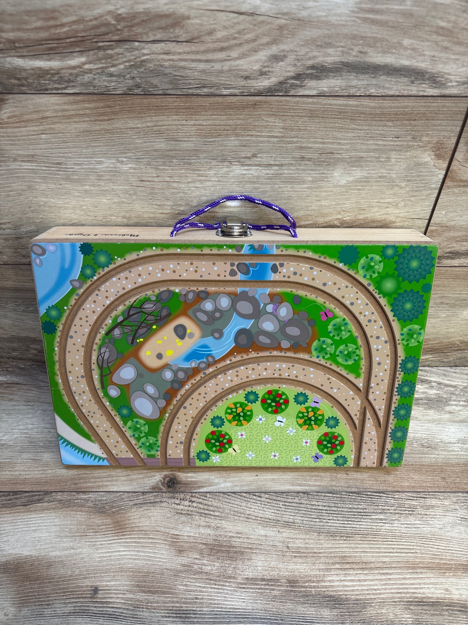 - 19-piece magical royal kingdom play set with wooden storage case that unfolds to create playing surface with built-in tracks