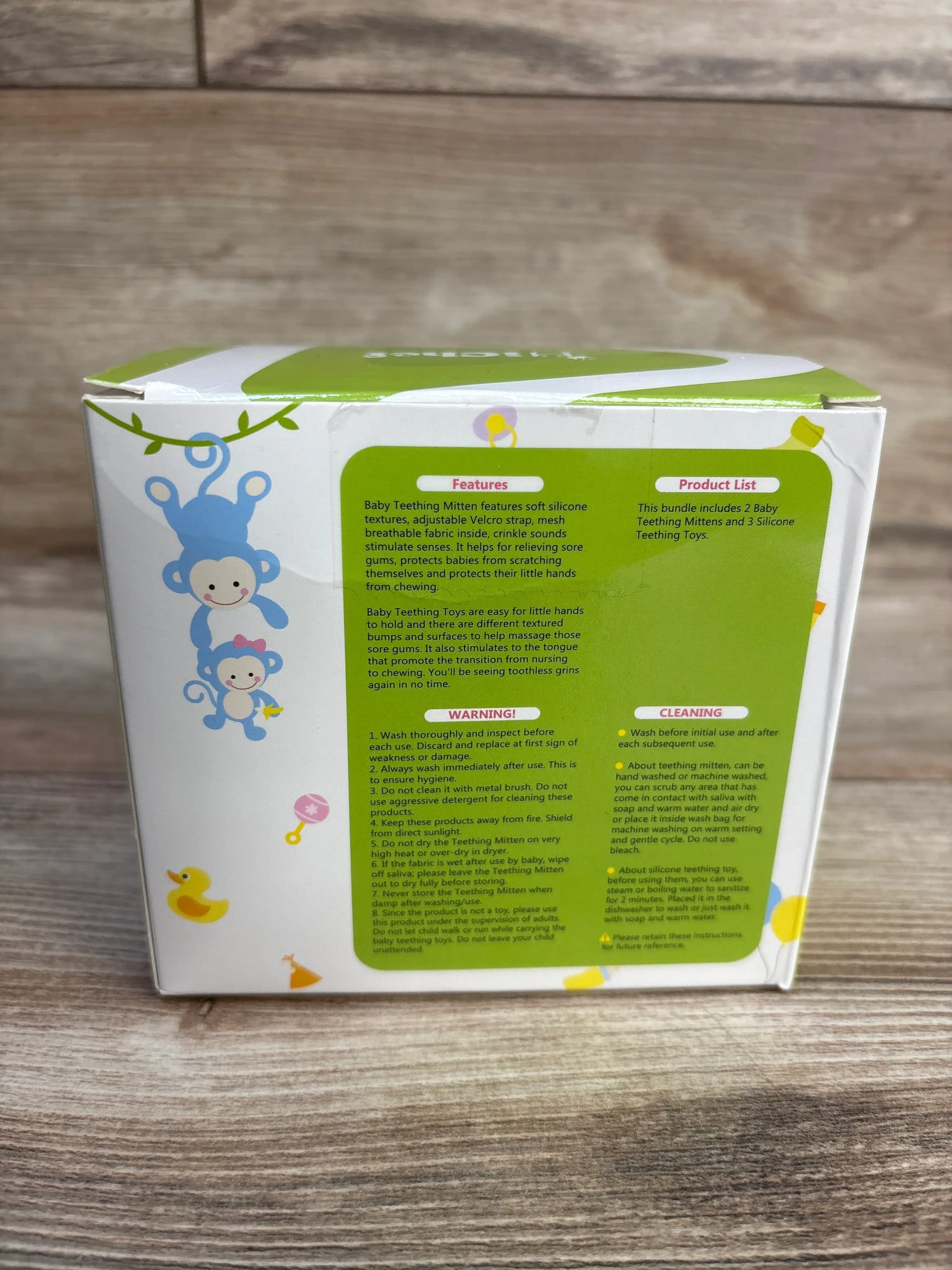 Teething mitten features a mouth-massaging bumpy texture and crinkle sound for baby self-entertaining. Adjustable Velcro strap to ensure the teething mitts stay on the little hand all the time. And the skin-friendly and breathable fabric absorbs drool, saving time from cleaning the little hands and clothes, and super easy to clean