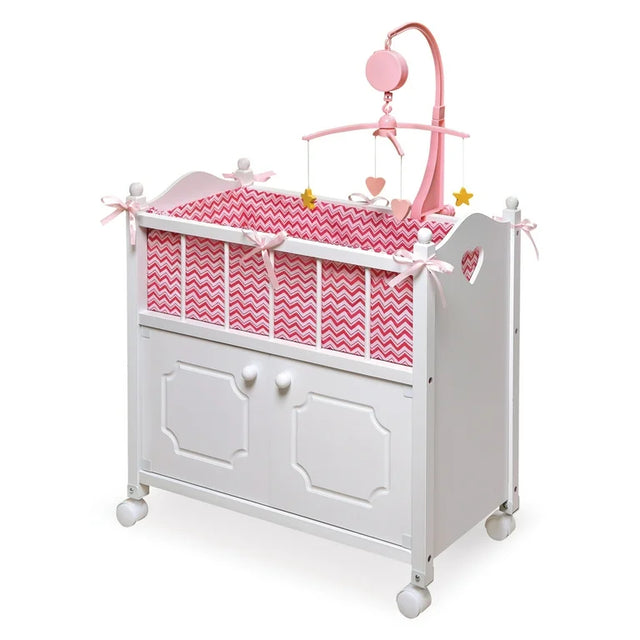 NEW Badger Basket Cabinet Doll Crib with Chevron Bedding Pink/White