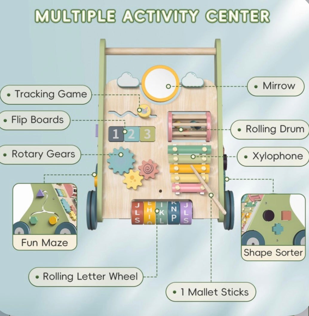 - MULTIPLE ACTIVITY CENTER: In addition to serving as a walker, it comes with a lively interactive panel, rolling letter wheel, xylophone, flip board, tracking game and a variety of other toys for 1 year olds. This fun panel will work on your baby's hand-eye coordination and cognitive skills while enriching their
